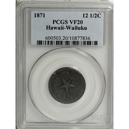 <B>1871 S$1 Wailuku 12 1/2 Cent Plantation Token VF20 PCGS.</B></I> Medcalf 2TE-2. A medium brown representative of this rare Hawaiian plantation token. Better struck than often seen, since all legends are clear. Late dies with an interesting reverse cud at 4 o'clock. The left reverse has a cluster of thin marks. Listed on page 376 of the 2007 <I>Guide Book.</B></I><BR><BR><b>Shipping:</b> Coin/Currency (<a target="_blank" href="http://www.heritageauctions.com/common/shipping.php">view shipping information</a>)