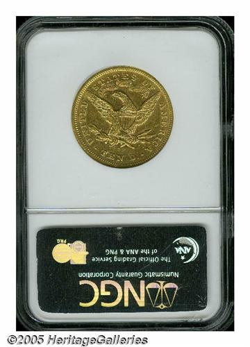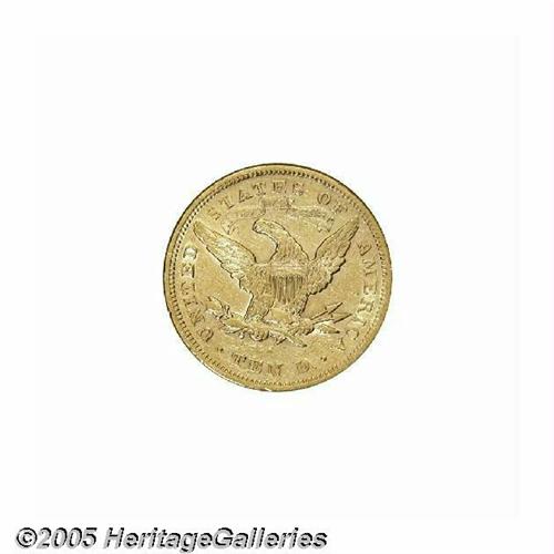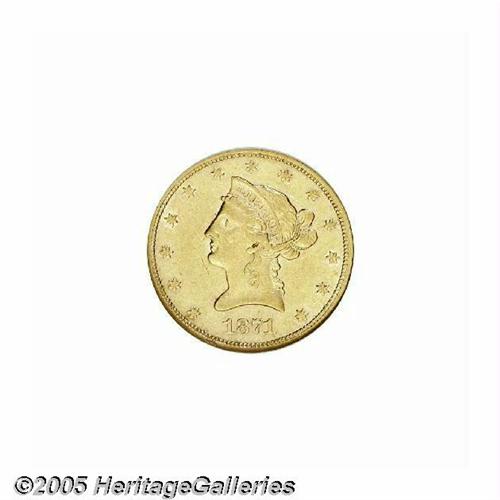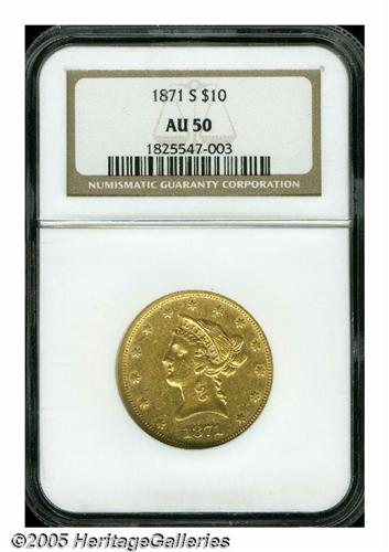 <B>1871-S<$10> AU50 NGC.</B></I> A seldom offered early With Motto S-mint that is perhaps even more challenging than its already low mintage of 16,500 pieces would suggest. This bright yellow-gold example is rather heavily marked, as usual, including a shallow cut on Liberty's cheek and another in front of her chin. The mintmark is characteristically small and indistinct. Population: 3 in 50, 14 finer (6/05).