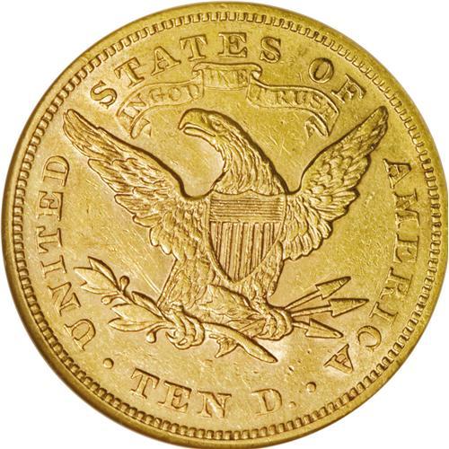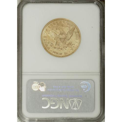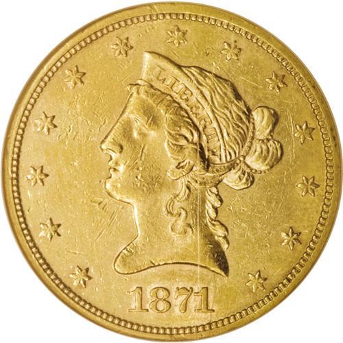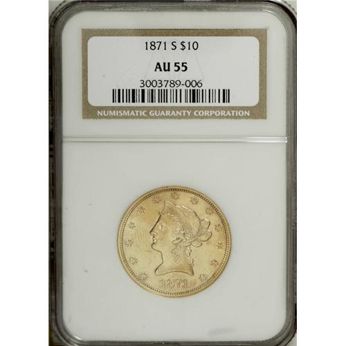 <B>1871-S $10 AU55 NGC.</B></I> An underappreciated early Motto issue that, when found, is usually in VF and XF grades. Neither NGC nor PCGS have certified any pieces as Mint State. Luster illuminates the borders and devices, and noticeable marks are relegated to the left obverse. Census: 9 in 55, 4 finer (12/06).<BR><BR><b>Shipping:</b> Coin/Currency (<a target="_blank" href="http://www.heritageauctions.com/common/shipping.php">view shipping information</a>)
