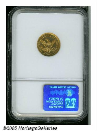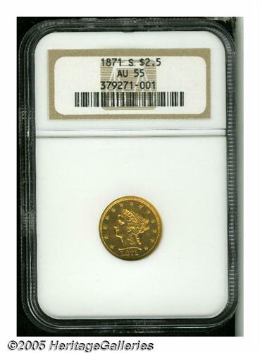 <B>1871-S<$2 1/2> AU55 NGC.</B></I> A honey-gold example that has relatively sharp details. The borders and devices have bright luster. A small scratch resides in the field near the eagle's beak, but the surfaces are otherwise only lightly abraded. The second line in the second stripe is faint, as struck due to die polish. Only 22,000 pieces were struck.