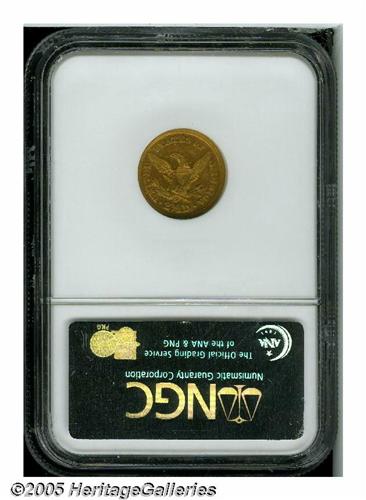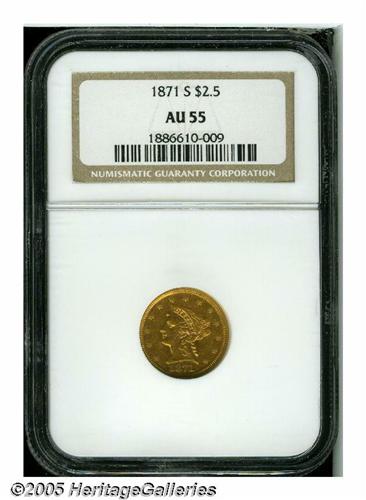 <B>1871-S<$2 1/2> AU55 NGC.</B></I> A low mintage issue with only 22,000 pieces struck, this is an attractive example that shows just a bit of friction and deep golden-orange patination, with traces of luster in the recessed areas. Except for some of Liberty's hair curls and the eagle's leg feathers, the design elements are well defined. A few miniscule marks scattered about are not bothersome. Population: 31 in 55, 73 finer (5/05).