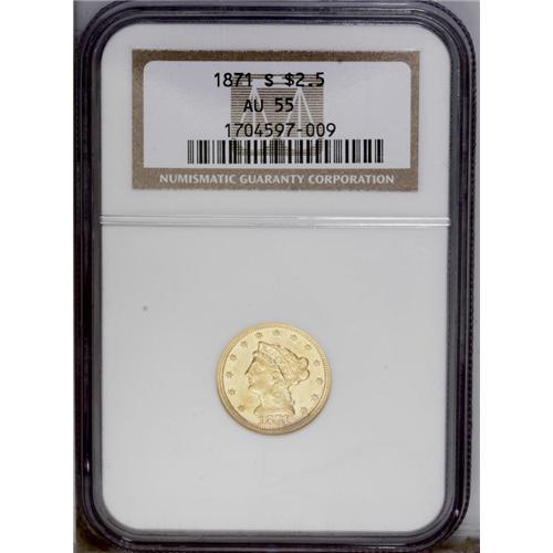 <B>1871-S<$2 1/2> AU55 NGC.</B></I> Attractive for the grade, with semi-prooflike fields near the devices. An underrated S-mint issue with only 22,000 minted. Few are seen finer than the present example.<BR><I>From The Steve Glenn Collection.</B></I> <BR><BR><B>Important notice:</B> Heritage usually auctions material at the rate of 200-250 lots per hour. On some occasions eBay Live bid software or the Internet may not be able to keep up with the pace of the auction. We recommend placing a realistic absentee bid now as insurance to avoid disappointment. Occasionally the auctioneer may eliminate or reject an eBay Live bid, and the auctioneer may also reopen a lot after the close of the eBay live bidding (usually because we missed an audience bid), and may reject your bid even if it shows you as the winning bidder. By bidding via eBay Live, you agree that Heritage may award the lot to another bidder at its sole discretion under the circumstances described above or any other reasonable circumstances. Since eBay bids are not shown to us until we open the lot on the floor, we treat those bids just like floor bids. In most cases the floor responds before the eBay bid is presented to us, due to Internet lag time, so for consistency we have made it a policy that floor bids are always considered first over tie eBay live bids. Also please note that all Heritage lots purchased through eBay Live carry a 20% Buyer's Premium. Please make sure you read the Terms and Conditions before you bid. This lot is being auctioned in conjunction with a live floor auction by Heritage Galleries & Auctioneers. All final auction and invoice information will be supplied by Heritage Galleries & Auctioneers, and all other information should be considered preliminary. Lot:2423 <BR><BR><B>Winning Notification and Billing:</B> After the FINAL session in this auction is complete, Heritage will send e-mail and snail mail invoices. This process normally takes several days. All final auction and invoice information will be supplied by Heritage Galleries & Auctioneers, and all other information should be considered preliminary. <BR><BR>This auction will be conducted on a live auction floor and over the Internet through eBay Live. If you choose to place an absentee bid, please take a moment to <font color='#0000ff'><u><a href='http://pages.ebay.com/liveauctions/help/before/laabsentee.html'>learn how eBay Live absentee bidding works</a></u></font><font color='#000000'>