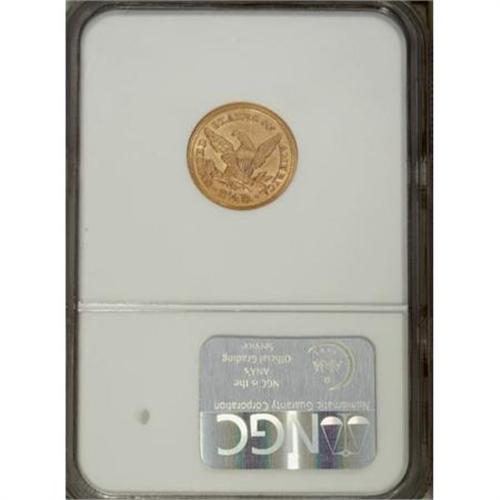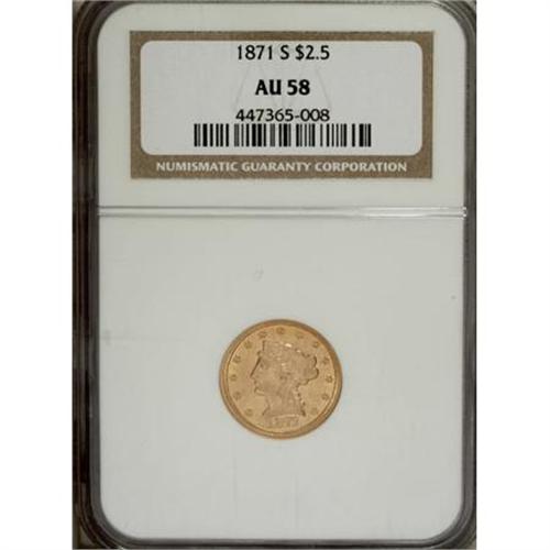 <B>1871-S $2 1/2 AU58 NGC.</B></I> An attractive near-Mint survivor from this issue of just 22,000 pieces, well-defined with virtually intact luster in the bright lemon-gold fields. Minimally marked and attractive. Census: 59 in 58, 29 finer (3/08).<BR><BR><B>Coin Engraver:</B> Christian Gobrecht<BR><BR><b>Shipping:</b> Coins & Currency (<a target="_blank" href="http://www.heritageauctions.com/common/shipping.php">view shipping information</a>)