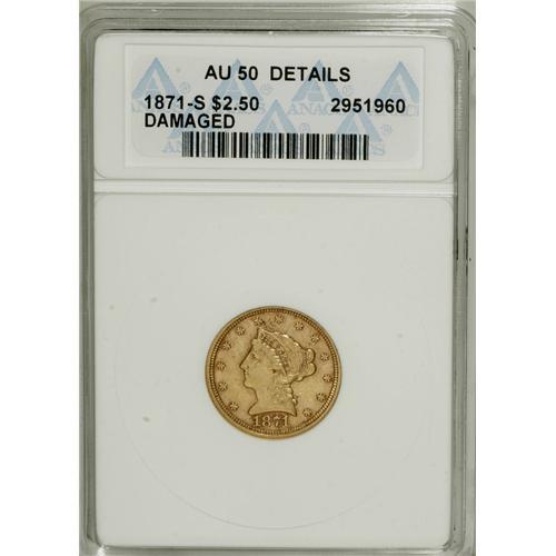 <B>1871-S $2 1/2 --Damaged--ANACS. AU50 Details.</B></I> NGC Census: (12/126). PCGS Population (16/42). Mintage: 22,000. Numismedia Wsl. Price for NGC/PCGS coin in AU50: $421. (#7814)<BR><BR><b>Shipping:</b> Coins & Currency (<a target="_blank" href="http://www.heritageauctions.com/common/shipping.php">view shipping information</a>)
