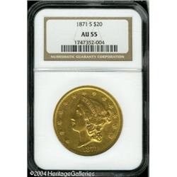 1871-S $20 AU55 NGC. Well struck, lustrous, and li 1871-S $20 AU55 NGC.