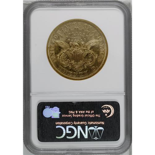 <B>1871-S<$20> AU58 NGC.</B></I> Like so many others of the Type Two design, this example has extensive abrasions on the surface, and yet it retains virtually full luster with light to medium yellow color.