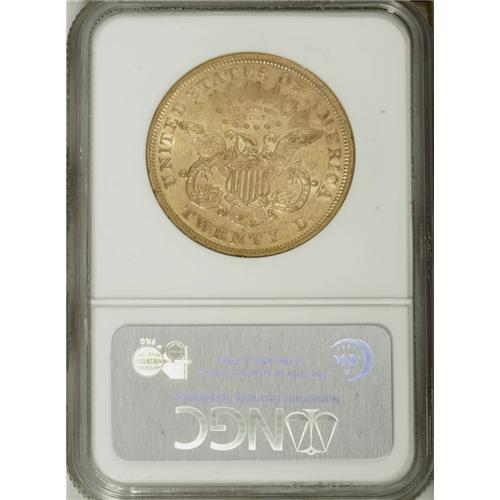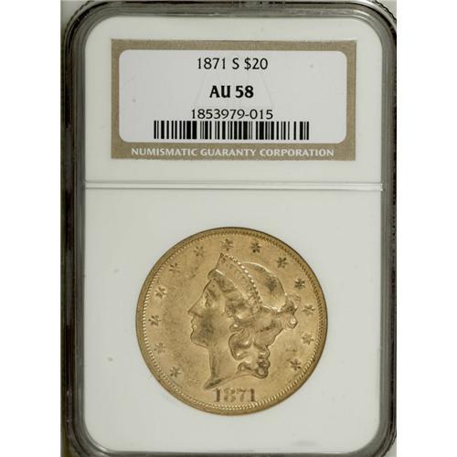 <B>1871-S $20 AU58 NGC.</B></I> This nearly Mint State Type Two example is refreshingly devoid of obtrusive bagmarks, although slight friction on the cheek denies a higher grade. The 1871-S preceded widespread export into European vaults, and is scarce at the AU58 level.<BR><BR><b>Shipping:</b> Coins & Currency (<a target="_blank" href="http://www.heritageauctions.com/common/shipping.php">view shipping information</a>)