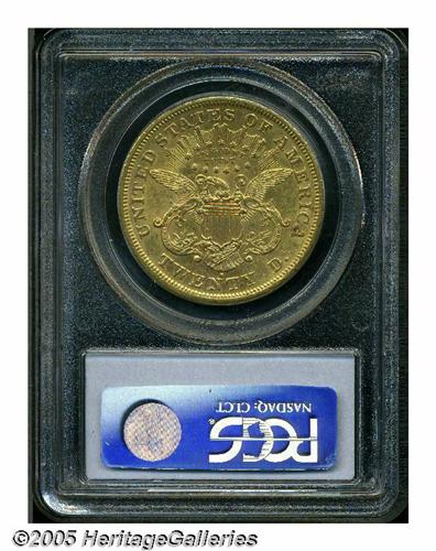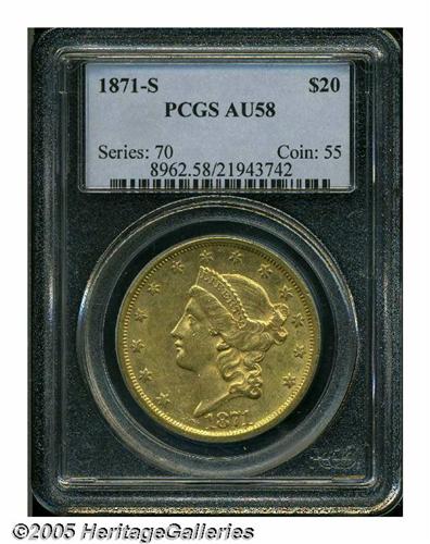 <B>1871-S<$20> AU58 PCGS.</B></I> As with most Type Two double eagles, the 1871-S is a condition rarity, with AU coins being very scarce. Well detailed with substantial luster, for the grade, and pleasing lime-green coloration over both sides. Traces of highpoint wear and numerous small abrasions, on each side, define this as a lightly circulated example. Population: 47 in 58, 39 finer (4/05).