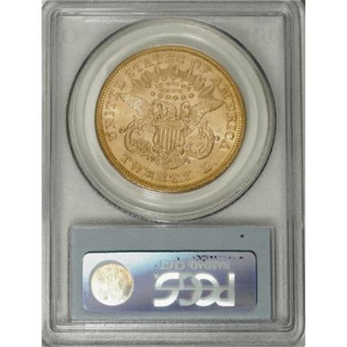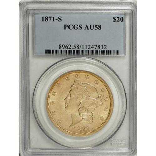 <B>1871-S $20 AU58 PCGS.</B></I> This San Francisco issue is surprisingly difficult to locate in Mint State, perhaps because the large-scale export of Federal gold coins to foreign bank holdings had yet to occur. This piece has noticeable luster across the open fields, although the many tiny marks suggest brief handling. Population: 61 in 58, 45 finer (7/07).<BR><BR><B>Coin Engraver:</B> James B. Longacre<BR><BR><b>Shipping:</b> Coins & Currency (<a target="_blank" href="http://www.heritageauctions.com/common/shipping.php">view shipping information</a>\)