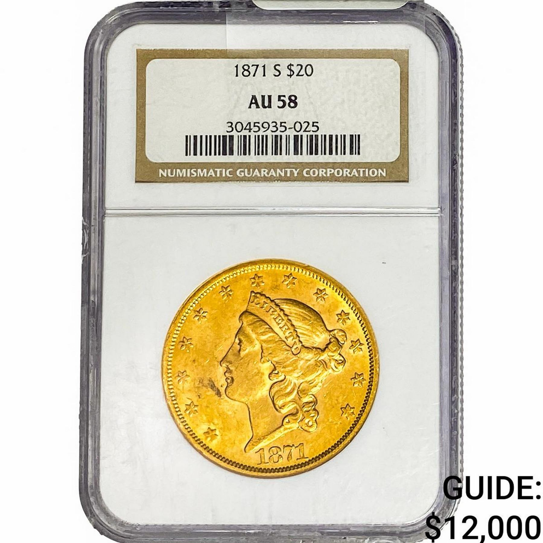 1871-S $20 Gold Double Eagle NGC AU58