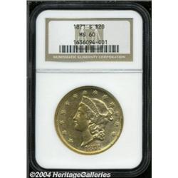 <table><tbody><tr><td><table> <TR><TD width="100%"><TABLE cellSpacing=1 cellPadding=3 width="100%" border=0><TBODY><TR><TD width="100%" bgColor=#79735c><FONT face=arial color=#ffffff size=3><B>Description</B> </FONT></TD></TR><TR><TD width="100%" bgColor=#ffffff><FONT face=arial size=2><B>1871-S $20 MS60 NGC.</B></I> As with most Type Two twenties, the 1871-S is a condition rarity with AU coins very scarce and strict Uncirculated pieces limited to only a few dozen examples. The surfaces here are fully lustrous and tinted a light rose, with myriad contact marks that serve to limit the grade.<BR><I>From a Magnificent Collection of Double Eagles.</B></I> </FONT></TD></TR></TBODY></TABLE></TD></TR></TBODY></TABLE><BR><A name=PricesRealized></A><TABLE cellSpacing=0 cellPadding=0 width="100%" bgColor=#000000 border=0><TBODY><TR><TD width="100%"><TABLE cellSpacing=1 cellPadding=3 width="100%" border=0><TBODY><TR><TD width="100%" bgColor=#79735c><A name=PR><FONT face=arial color=#ffffff size=3><B>Previous Prices from Heritage Auctions</B> </FONT></A></TD></TR><TR><TD bgColor=#f6f6ed><TABLE cellSpacing=0 cellPadding=0 width="100%" border=1><TBODY><TR><TD align=middle width="33%"><B>Date</B></TD><TD align=middle width="33%"><B>Service</B></TD><TD align=middle width="33%"><B>Price</B></TD></TR><TR bgColor=whitesmoke><TD width="33%"><B>09/09/2003</B></TD><TD width="33%">NGC</TD><TD width="33%">$2,990.00</TD></TR><TR bgColor=whitesmoke><TD width="33%"><B>01/12/2002</B></TD><TD width="33%">NGC</TD><TD width="33%">$2,990.00</TD></TR><TR bgColor=whitesmoke><TD width="33%"><B>02/24/1995</B></TD><TD width="33%">NGC</TD><TD width="33%">$2,200.00</TD></TR><TR bgColor=whitesmoke><TD width="33%"><B>01/01/1990</B></TD><TD width="33%">PCGS</TD><TD width="33%">$1,705.00</TD></TR></TBODY></TABLE></TD></TR><TR><TD bgColor=#ffffff><FONT face=arial size=1 ?>PLEASE NOTE: All prices realized reflect the final hammer price PLUS the buyer's premium in auctions that charge a buyer's premium. Each item has a notation at the top of the listing indicating whether that lot included a buyer's premium. Example: A item that sells with a final hammer price of $100 and a 20% buyer's premium will display with a price realized of $120. All information listed is intended to be as accurate as possible, but errors are possible. Please use this guide carefully and inform us of any inaccuracies. </FONT></TD></TR></TBODY></TABLE></TD></TR></TBODY></TABLE><BR><TABLE cellSpacing=0 cellPadding=0 width="100%" bgColor=#000000 border=0><TBODY><TR><TD width="100%"><TABLE cellSpacing=1 cellPadding=3 width="100%" border=0><TBODY><TR><TD width="100%" bgColor=#79735c colSpan=6><FONT face=arial color=#ffffff size=3><B>Price Guide*</B> </FONT></TD></TR><TR bgColor=#f6f6ed><TD align=middle><B>Grade</B> </TD><TD align=middle><B>Coin World<BR>(Trends)</B> </TD><TD align=middle><B>Numismedia<BR>Retail</B> </TD><TD align=middle><B>Numismedia<BR>Wholesale</B> </TD><TD align=middle><B>Coin<BR>Universe</B> </TD><TD align=middle><B>Heritage<BR>Value Index</B> </TD></TR><TR bgColor=#ffffff><TD align=middle>58</TD><TD align=right>$2,000.00</TD><TD align=right>---</TD><TD align=right>$1,350.00</TD><TD align=right>---</TD><TD align=right>$1,390.75</TD></TR><TR style="FONT-WEIGHT: bold" bgColor=#cccfdd><TD align=middle>60</TD><TD align=right>$4,500.00</TD><TD align=right>---</TD><TD align=right>$3,350.00</TD><TD align=right>$3,500.00</TD><TD align=right>$2,646.25</TD></TR><TR bgColor=#ffffff><TD align=middle>61</TD><TD align=right>---</TD><TD align=right>---</TD><TD align=right>$4,700.00</TD><TD align=right>$4,000.00</TD><TD align=right>$4,516.88</TD></TR><TR bgColor=#ffffff><TD colSpan=6><FONT size=1>*All information listed is intended to be as accurate as possible, but errors are possible. No item may be returned or refused based on this information which is provided as a service to our customers. You should contact each pricing source directly to determine the accuracy of this information. </FONT></TD></TR></TBODY></TABLE></TD></TR></TBODY></TABLE><BR><TABLE cellSpacing=0 cellPadding=0 width="100%" bgColor=#000000 border=0><TBODY><TR><TD width="100%"><TABLE cellSpacing=1 cellPadding=3 width="100%" border=0><TBODY><TR><TD width="100%" bgColor=#79735c><FONT face=arial color=#ffffff size=3><B>Population Guide</B> </FONT></TD></TR><TR bgColor=#ffffff><TD align=middle><!-- Begin Output of Population Grid--><TABLE cellSpacing=0 cellPadding=0 width="100%" border=0><TBODY><TR><TD vAlign=center><TABLE cellSpacing=0 width="100%" border=1 cellsadding="3"><TBODY><TR><TD vAlign=center><TABLE cellSpacing=0 cellPadding=3 width="100%" border=1><TBODY><TR><TD vAlign=center align=middle bgColor=#f0f1e8 colSpan=2 <CENTER><FONT face=Arial size=2><B>PCGS Pop </B></FONT><CENTER></CENTER></TD><TD vAlign=center align=middle bgColor=#f0f1e8 colSpan=2><CENTER><FONT face=Arial size=2><B>NGC Pop</B></CENTER></FONT></TD></TR><TR><TD vAlign=center><FONT face=Arial size=2>(60)</FONT> </TD><TD vAlign=center align=right><FONT face=Arial size=2>10</FONT> </TD><TD vAlign=center><FONT face=Arial size=2>(60)</FONT> </TD><TD vAlign=center align=right><FONT face=Arial size=2>42</FONT> </TD></TR><TR><TD vAlign=center><FONT face=Arial size=2>(>60)</FONT> </TD><TD vAlign=center align=right><FONT face=Arial size=2>25</FONT> </TD><TD vAlign=center><FONT face=Arial size=2>(>60)</FONT> </TD><TD vAlign=center align=right><FONT face=Arial size=2>80</FONT> </TD></TR></TBODY></TABLE></TD></TR></TBODY></TABLE></TD></TR></TBODY></TABLE><!-- End Output of Population Grid--></TD></TR></TBODY></TABLE></TD></TR></TBODY></TABLE><BR><TABLE cellSpacing=0 cellPadding=0 width="100%" bgColor=#000000 border=0><TBODY><TR> <font color='#000000'><span style='background-color: #FFFFFF'><td bgcolor='#FFFFFE'> Important notice: Heritage usually auctions material at the rate of 200-250 lots per hour. On some occasions eBay Live bid software or the Internet may not be able to keep up with the pace of the auction. We recommend plac