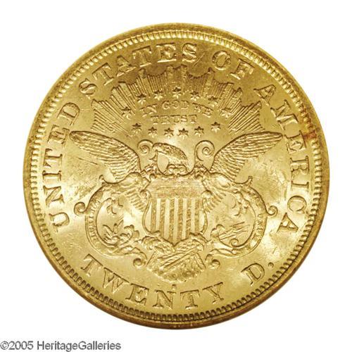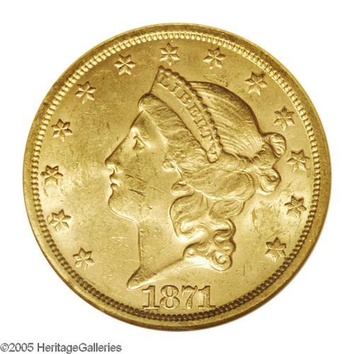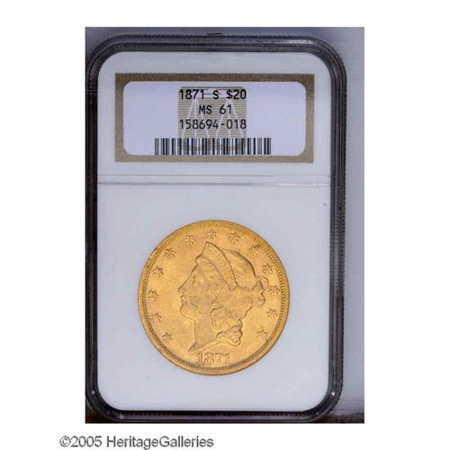 <B>1871-S<$20> MS61 NGC.</B></I> A bold example with full luster and mustard-gold color. A couple of moderate marks on the cheek, but otherwise less abraded than usual for the grade. The date shows evidence of repunching, with the dash from the base of a 1 present west of the 7 in the date. Scarce in Mint State despite a healthy mintage. Census: 49 in 61, 22 finer (11/05).<BR><I>From The Meads Point Collection.</B></I>