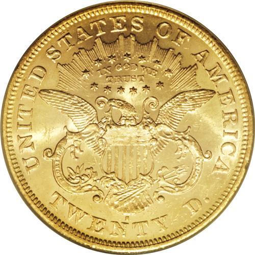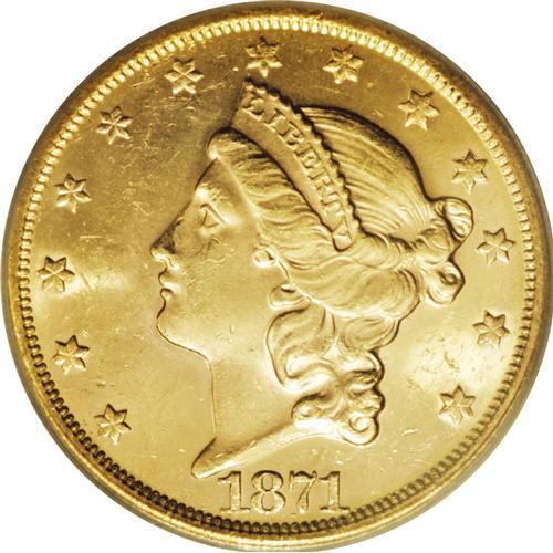 <B>1871-S $20 MS63 PCGS.</B></I> Despite the generous mintage of more than 900,000 coins, few examples today are found in the higher Mint State grades, as the average example grades about AU55 or so due to some recent repatriations of low-Mint State coins from overseas hoards. This piece shows exemplary yellow-orange surfaces with brilliant luster and only light field chatter. The strike is razor-sharp, and the overall appeal is exemplary. This stunning coin is the finest graded at PCGS by two grade points, while NGC has certified three pieces as MS63, with one finer (4/07).<BR><BR><b>Shipping:</b> Coins & Currency (<a target="_blank" href="http://www.heritageauctions.com/common/shipping.php">view shipping information</a>)
