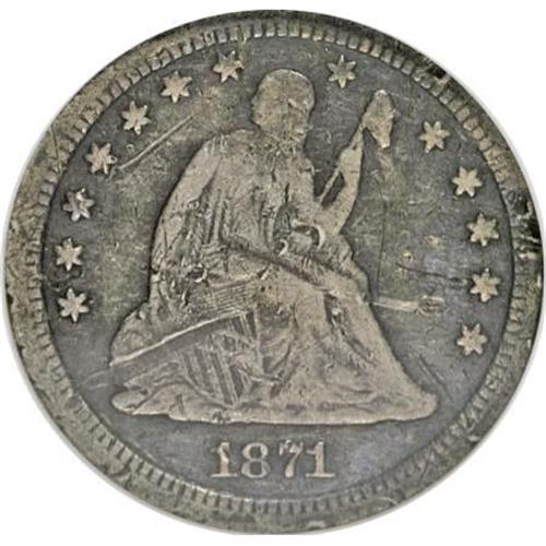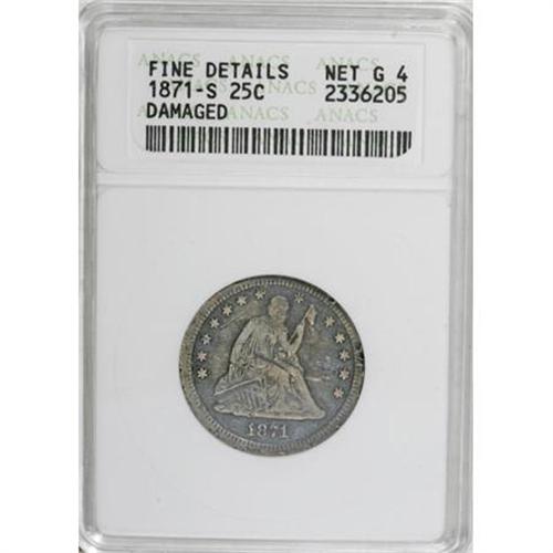 <B>1871-S 25C --Damaged--ANACS. Fine Details, Net Good 4.</B></I> NGC Census: (0/25). PCGS Population (0/31). Mintage: 30,900. Numismedia Wsl. Price for NGC/PCGS coin in G4 : $275. (#5480)<BR><BR><B>Coin Engraver:</B> Christian Gobrecht<BR><BR><b>Shipping:</b> Coins & Currency (<a target="_blank" href="http://www.heritageauctions.com/common/shipping.php">view shipping information</a>)
