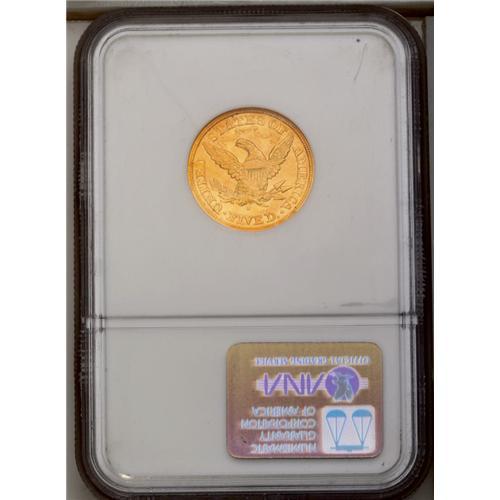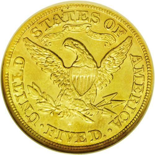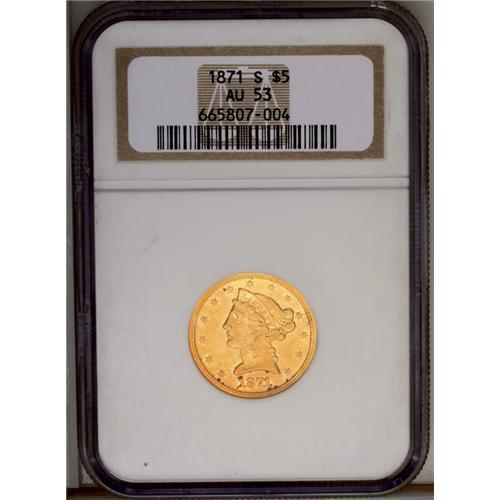 <B>1871-S<$5> AU53 NGC.</B></I> Double Punched Date. Breen-6678. Close examination reveals light repunching on all four digits of the date. A difficult San Francisco half eagle and an even greater condition scarcity, from a deceptively high mintage of 25,000 coins. This example is sharply detailed, even on Liberty's highest curls and on the eagle's neck, with the normal quota of mostly inoffensive marks on each side. Some soft reddish-golden color is seen overall, and several specks of black, ink-like color are seen surrounding the date.