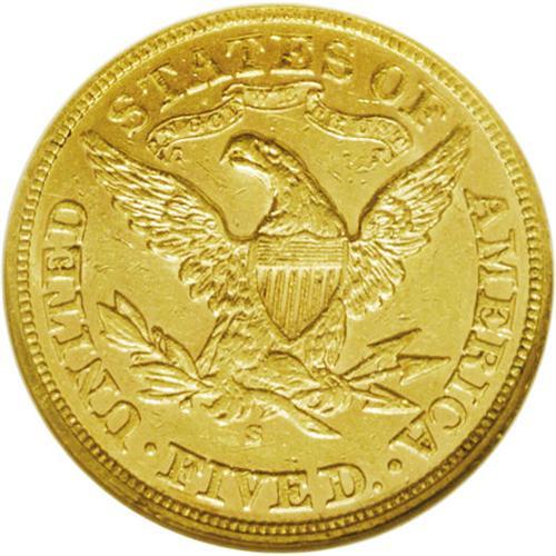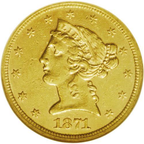 <B>1871-S<$5> AU55 NGC.</B></I> Bright yellow-gold throughout, with traces of prooflike reflectivity in the fields. This is the recut date variety, with the date first punched low, then corrected. Sharply struck on the obverse, the reverse with minor weakness on the lower portion of the eagle and the attendant devices. A rare date in this lofty grade, and worthy of a strong bid for the clean surfaces and general eye appeal. <BR><BR><B>Important notice:</B> Heritage usually auctions material at the rate of 200-250 lots per hour. On some occasions eBay Live bid software or the Internet may not be able to keep up with the pace of the auction. We recommend placing a realistic absentee bid now as insurance to avoid disappointment. Occasionally the auctioneer may eliminate or reject an eBay Live bid, and the auctioneer may also reopen a lot after the close of the eBay live bidding (usually because we missed an audience bid), and may reject your bid even if it shows you as the winning bidder. By bidding via eBay Live, you agree that Heritage may award the lot to another bidder at its sole discretion under the circumstances described above or any other reasonable circumstances. Since eBay bids are not shown to us until we open the lot on the floor, we treat those bids just like floor bids. In most cases the floor responds before the eBay bid is presented to us, due to Internet lag time, so for consistency we have made it a policy that floor bids are always considered first over tie eBay live bids. Also please note that all Heritage lots purchased through eBay Live carry a 20% Buyer's Premium. Please make sure you read the Terms and Conditions before you bid. This lot is being auctioned in conjunction with a live floor auction by Heritage Galleries & Auctioneers. All final auction and invoice information will be supplied by Heritage Galleries & Auctioneers, and all other information should be considered preliminary. Lot:2783 <BR><BR><B>Winning Notification and Billing:</B> After the FINAL session in this auction is complete, Heritage will send e-mail and snail mail invoices. This process normally takes several days. All final auction and invoice information will be supplied by Heritage Galleries & Auctioneers, and all other information should be considered preliminary. <BR><BR>This auction will be conducted on a live auction floor and over the Internet through eBay Live. If you choose to place an absentee bid, please take a moment to <font color='#0000ff'><u><a href='http://pages.ebay.com/liveauctions/help/before/laabsentee.html'>learn how eBay Live absentee bidding works</a></u></font><font color='#000000'>