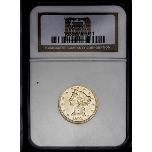 1871-S $5 AU55 NGC. Bright yellow-gold throughout, wit