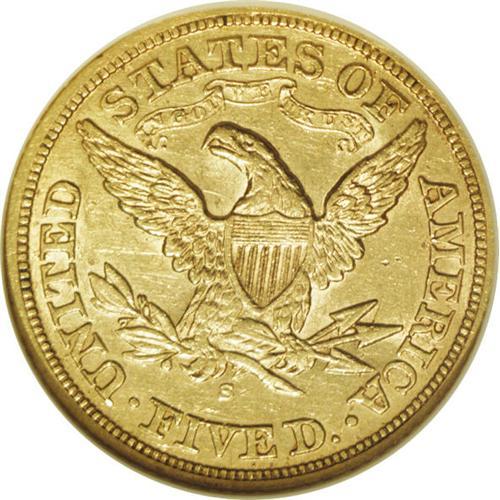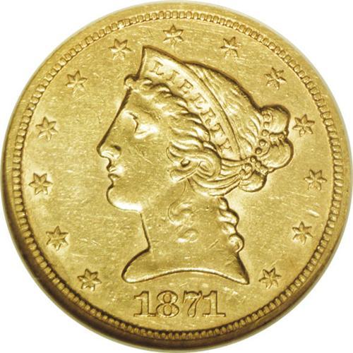 <B>1871-S $5 AU55 NGC.</B></I> Bright yellow-gold throughout, with an aura of satin luster around the devices and within the protected areas. This is the recut date variety, with the date first punched low, then corrected. Sharply struck on both sides, the only collision of note are two parallel bag marks over Liberty's eye. A rare date in this lofty grade, and worthy of a strong bid for the clean surfaces and general eye appeal.<BR><BR><b>Shipping:</b> Coin/Currency (<a target="_blank" href="http://www.heritageauctions.com/common/shipping.php">view shipping information</a>)
