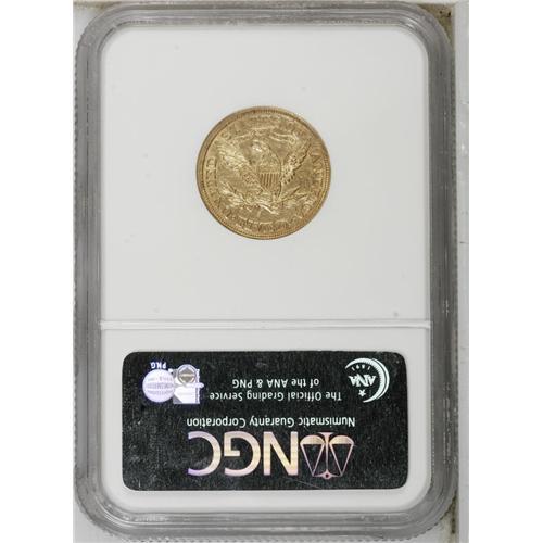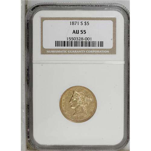 1871-S $5 AU55 NGC. Bright yellow-gold throughout, wit