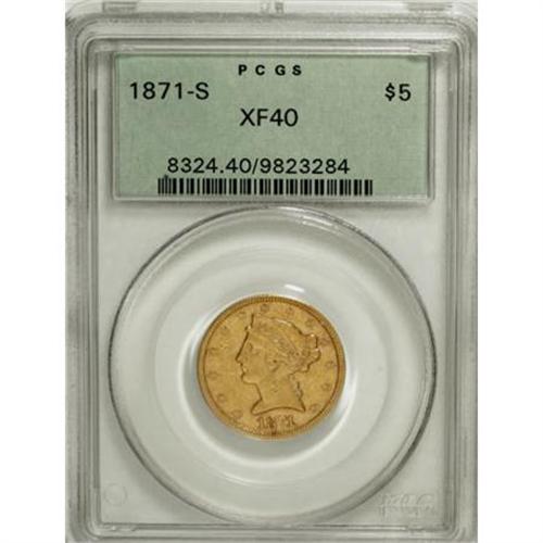 <B>1871-S $5 XF40 PCGS.</B></I> The date is lightly repunched south, visible on all four digits. Since only 25,000 pieces were struck, the entire issue likely shares the characteristic. The curls and eagle's neck are typically brought up, but sharpness elsewhere is consistent with a finer grade. A bright mark is noted near star 4. Certified in a green label holder. Population: 10 in 40, 41 finer (8/07).<BR><BR><B>Coin Engraver:</B> Christian Gobrecht<BR><BR><b>Shipping:</b> Coins & Currency (<a target="_blank" href="http://www.heritageauctions.com/common/shipping.php">view shipping information</a>)