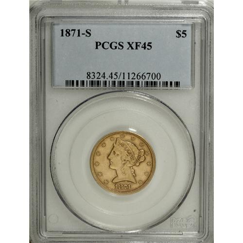 <B>1871-S $5 XF45 PCGS.</B></I> Jeff Garrett and Ron Guth (2006) write that very few 1871-S half eagles are offered for sale in any grade, and when they are, they are likely to be heavily circulated. The Choice XF specimen in this lot displays honey-gold surfaces and faint hints of red. Nice detail is seen on the design elements, and just a few light ticks reside on each side. Population: 21 in 45, 20 finer (1/07).<BR><BR><b>Shipping:</b> Coins & Currency (<a target="_blank" href="http://www.heritageauctions.com/common/shipping.php">view shipping information</a>)