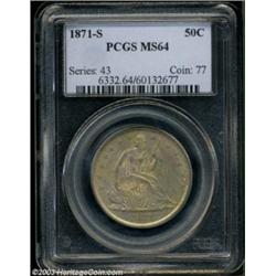 <table><tr><td><TABLE cellSpacing=0 cellPadding=0 width="100%" bgColor=#000000 border=0><TBODY> <TR><TD width="100%"><TABLE cellSpacing=1 cellPadding=3 width="100%" border=0><TBODY><TR><TD width="100%" bgColor=#79735c><FONT face=arial color=#ffffff size=3><B>Description</B> </FONT></TD></TR><TR><TD width="100%" bgColor=#ffffff><FONT face=arial size=2><B>1871-S 50C MS64 PCGS.</B></I> The 1871-S Half is rarely seen in high grades with all varieties rated by Wiley and Bugert as a low R.6 in mint condition. This piece is especially well defined with surprisingly clean surfaces. Both sides are covered with golden-olive toning that shows a light undertone of rose. Lustrous also. Population: 4 in 64, 6 finer (10/03). </FONT></TD></TR></TBODY></TABLE></TD></TR></TBODY></TABLE><BR><A name=PricesRealized></A><TABLE cellSpacing=0 cellPadding=0 width="100%" bgColor=#000000 border=0><TBODY><TR><TD width="100%"><TABLE cellSpacing=1 cellPadding=3 width="100%" border=0><TBODY><TR><TD width="100%" bgColor=#79735c><A name=PR><FONT face=arial color=#ffffff size=3><B>Previous Prices from Heritage Auctions</B> </FONT></A></TD></TR><TR><TD bgColor=#f6f6ed>No Prior Data Recorded </TD></TR><TR><TD bgColor=#ffffff><FONT face=arial size=1 ?>PLEASE NOTE: All prices realized reflect the final hammer price PLUS the buyer's premium in auctions that charge a buyer's premium. Each item has a notation at the top of the listing indicating whether that lot included a buyer's premium. Example: A item that sells with a final hammer price of $100 and a 20% buyer's premium will display with a price realized of $120. All information listed is intended to be as accurate as possible, but errors are possible. Please use this guide carefully and inform us of any inaccuracies. </FONT></TD></TR></TBODY></TABLE></TD></TR></TBODY></TABLE><BR><TABLE cellSpacing=0 cellPadding=0 width="100%" bgColor=#000000 border=0><TBODY><TR><TD width="100%"><TABLE cellSpacing=1 cellPadding=3 width="100%" border=0><TBODY><TR><TD width="100%" bgColor=#79735c colSpan=6><FONT face=arial color=#ffffff size=3><B>Price Guide*</B> </FONT></TD></TR><TR bgColor=#f6f6ed><TD align=middle><B>Grade</B> </TD><TD align=middle><B>Coin World<BR>(Trends)</B> </TD><TD align=middle><B>Numismedia<BR>Retail</B> </TD><TD align=middle><B>Numismedia<BR>Wholesale</B> </TD><TD align=middle><B>Coin<BR>Universe</B> </TD><TD align=middle><B>Heritage<BR>Value Index</B> </TD></TR><TR bgColor=#ffffff><TD align=middle>63</TD><TD align=right>$1,750.00</TD><TD align=right>---</TD><TD align=right>---</TD><TD align=right>$1,500.00</TD><TD align=right>$1,030.00</TD></TR><TR style="FONT-WEIGHT: bold" bgColor=#cccfdd><TD align=middle>64</TD><TD align=right>---</TD><TD align=right>---</TD><TD align=right>---</TD><TD align=right>$3,000.00</TD><TD align=right>$1,905.00</TD></TR><TR bgColor=#ffffff><TD align=middle>65</TD><TD align=right>---</TD><TD align=right>---</TD><TD align=right>$4,890.00</TD><TD align=right>---</TD><TD align=right>---</TD></TR><TR bgColor=#ffffff><TD colSpan=6><FONT size=1>*All information listed is intended to be as accurate as possible, but errors are possible. No item may be returned or refused based on this information which is provided as a service to our customers. You should contact each pricing source directly to determine the accuracy of this information. </FONT></TD></TR></TBODY></TABLE></TD></TR></TBODY></TABLE><BR><TABLE cellSpacing=0 cellPadding=0 width="100%" bgColor=#000000 border=0><TBODY><TR><TD width="100%"><TABLE cellSpacing=1 cellPadding=3 width="100%" border=0><TBODY><TR><TD width="100%" bgColor=#79735c><FONT face=arial color=#ffffff size=3><B>Population Guide</B> </FONT></TD></TR><TR bgColor=#ffffff><TD align=middle><!-- Begin Output of Population Grid--><TABLE cellSpacing=0 cellPadding=0 width="100%" border=0><TBODY><TR><TD vAlign=center><TABLE cellSpacing=0 width="100%" border=1 cellsadding="3"><TBODY><TR><TD vAlign=center><TABLE cellSpacing=0 cellPadding=3 width="100%" border=1><TBODY><TR><TD vAlign=center align=middle bgColor=#f0f1e8 colSpan=2 <CENTER><FONT face=Arial size=2><B>PCGS Pop </B></FONT><CENTER></CENTER></TD><TD vAlign=center align=middle bgColor=#f0f1e8 colSpan=2><CENTER><FONT face=Arial size=2><B>NGC Pop</B></CENTER></FONT></TD></TR><TR><TD vAlign=center><FONT face=Arial size=2>(64)</FONT> </TD><TD vAlign=center align=right><FONT face=Arial size=2>4</FONT> </TD><TD vAlign=center><FONT face=Arial size=2>(64)</FONT> </TD><TD vAlign=center align=right><FONT face=Arial size=2>4</FONT> </TD></TR><TR><TD vAlign=center><FONT face=Arial size=2>(>64)</FONT> </TD><TD vAlign=center align=right><FONT face=Arial size=2>6</FONT> </TD><TD vAlign=center><FONT face=Arial size=2>(>64)</FONT> </TD><TD vAlign=center align=right><FONT face=Arial size=2>2</FONT> </TD></TR></TBODY></TABLE></TD></TR></TBODY></TABLE></TD></TR></TBODY></TABLE><!-- End Output of Population Grid--></TD></TR></TBODY></TABLE></TD></TR></TBODY></TABLE><BR><TABLE cellSpacing=0 cellPadding=0 width="100%" bgColor=#000000 border=0><TBODY><TR> Important notice: Heritage usually auctions material at the rate of 200-250 lots per hour. On some occasions eBay Live bid software or the Internet may not be able to keep up with the pace of the auction. We recommend placing a realistic absentee bid now as insurance to avoid disappointment. Occasionally the auctioneer may eliminate or reject an eBay Live bid, and the auctioneer may also reopen a lot after the close of the eBay live bidding (usually because we missed an audience bid), and may reject your bid even if it shows you as the winning bidder. By bidding via eBay Live, you agree that Heritage may award the lot to another bidder at its sole discretion under the circumstances described above or any other reasonable circumstances. Also please note that all Heritage lots purchased through eBay Live carry a 20% Buyer's Premium. Please make sure you read the Terms and Conditions before you bid.</TD></TR></TBODY></TABLE></TD></TR></TBODY></TABLE>