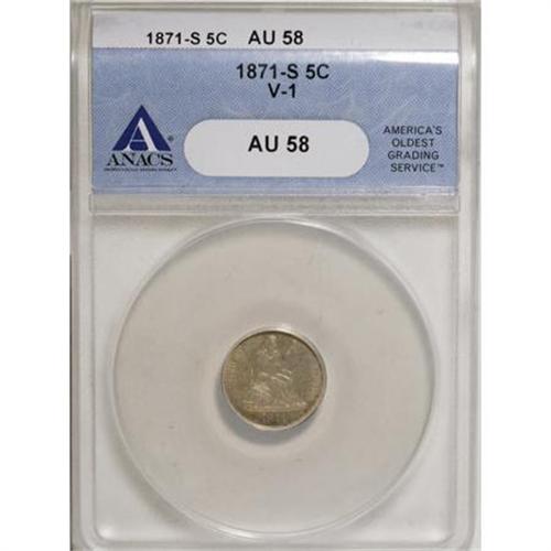 <B>1871-S H10C AU58 ANACS.</B></I> V-1. NGC Census: (13/63). PCGS Population (23/69). Mintage: 161,000. Numismedia Wsl. Price for NGC/PCGS coin in AU58: $183. (#4399)<BR><I>From The Al Blythe Collection of Half Dimes.</B></I><BR><BR><B>Coin Engraver:</B> Christian Gobrecht<BR><BR><b>Shipping:</b> Coins & Currency (<a target="_blank" href="http://www.heritageauctions.com/common/shipping.php">view shipping information</a>)