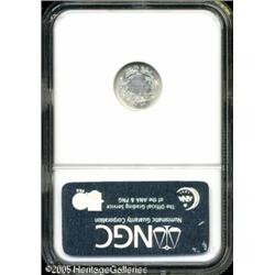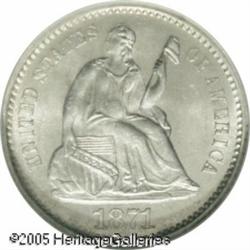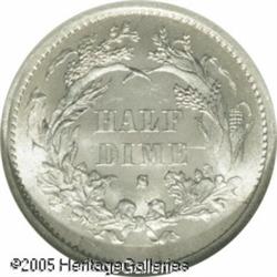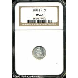 <B>1871-S H10C MS66 NGC.</B></I> The S mintmark is inside the wreath, as on all 1871-S half dimes. It was during the following year that the mintmark location was changed. This delightful Gem has fully lustrous and frosty surfaces. Both sides are fully brilliant without any trace of toning. Equivalent to the finest certified by either PCGS or NGC. Population: 3 in 66, 0 finer (1/05). Lot:6151