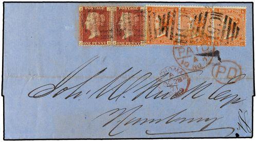 1871 ST. THOMAS a ALEMANIA. Circulada con sellos de Gran Bretaña de 1 p. rojo (2) y 4 p. naranja (3). Mat. de B.P.O. C-51 y fechador ST-THOMAS/PAID. MAGNIFICA.