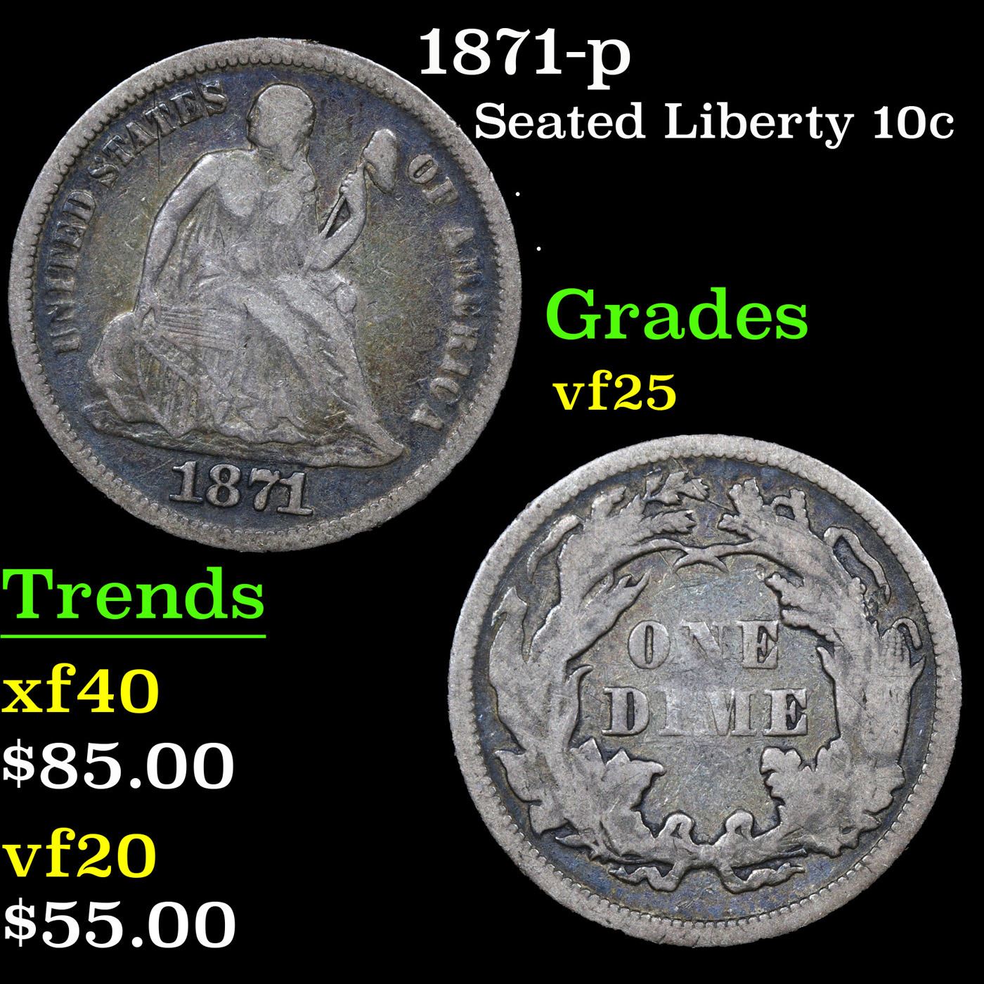 1871-p Seated Liberty Dime 10c Grades vf+.