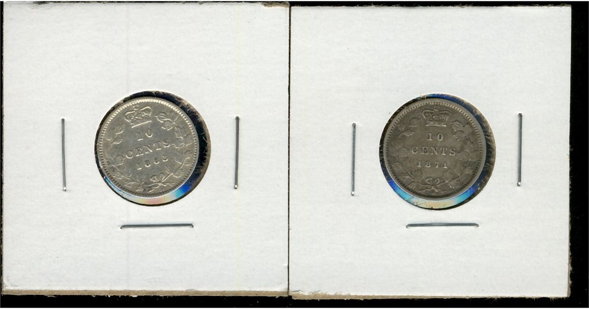 1871H 10¢ & 1883H 10¢.  Lot of 2 coins F+ to VF in grade.