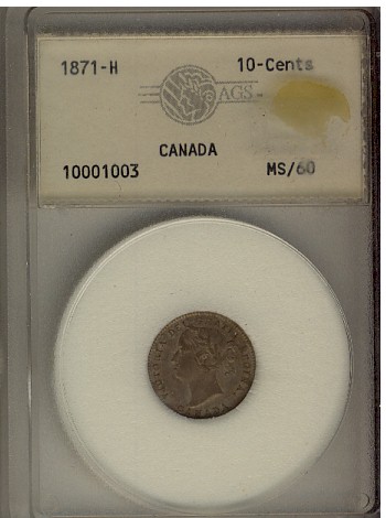 1871H 10¢ AGS MS60, nicely toned and accurately graded.
