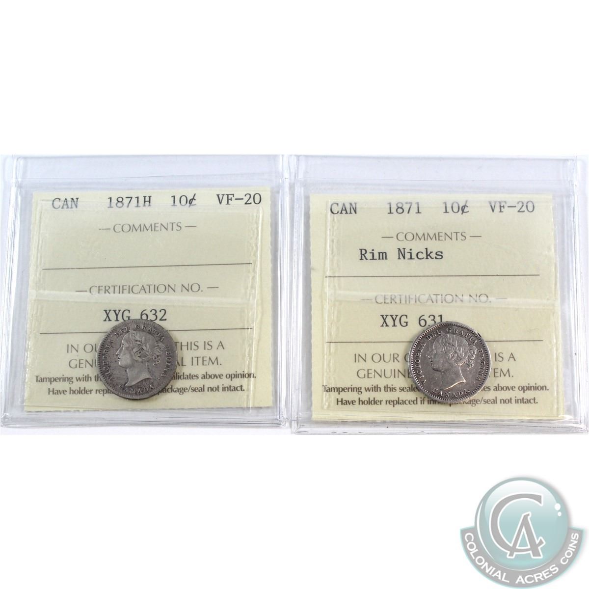 1871H & 1871 Rim Nicks 10-cent ICCS Certified VF-20. 2pcs
