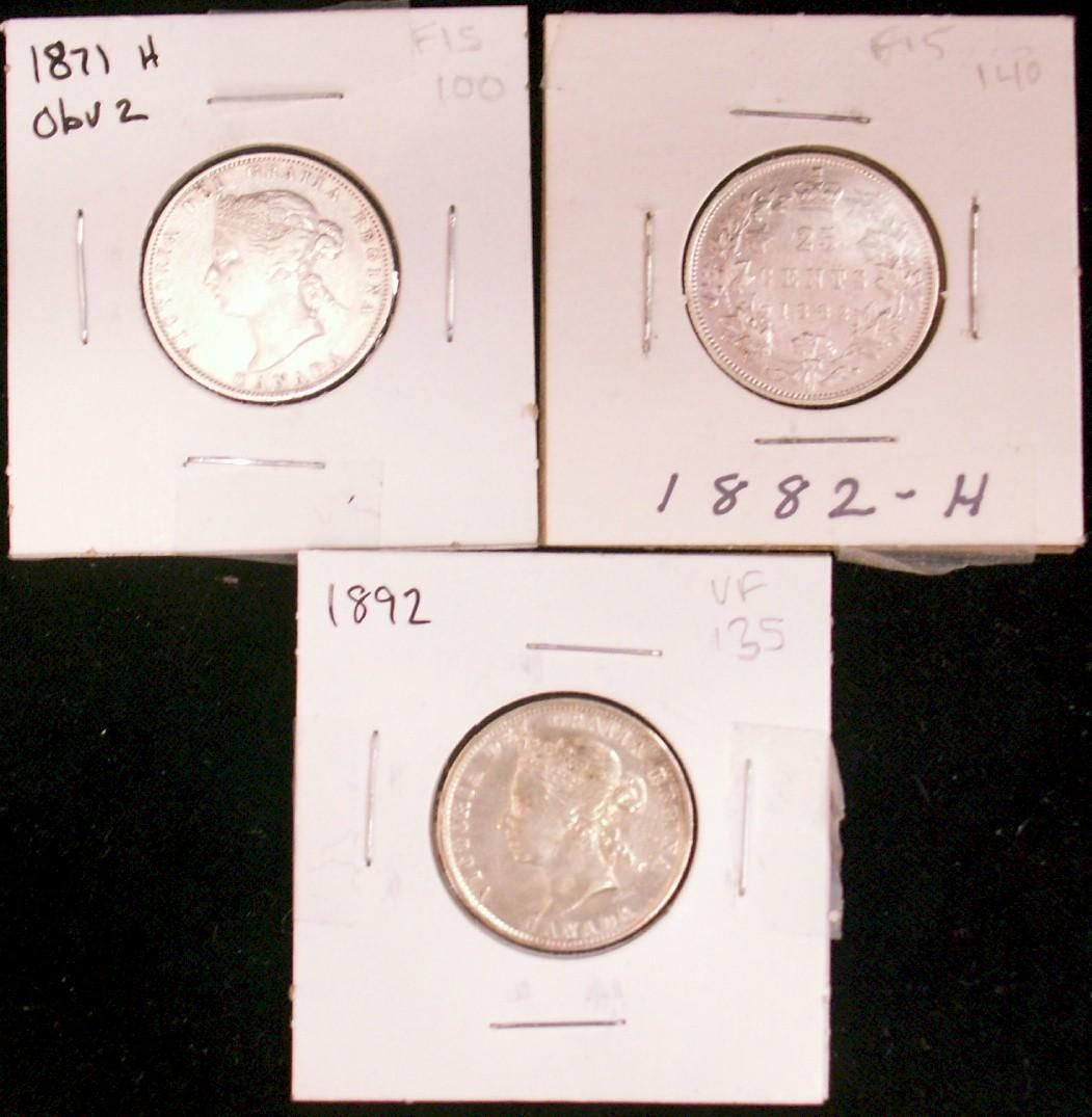 1871H, 1882H & 1892 25¢. Lot of 3 coins all F/VF.