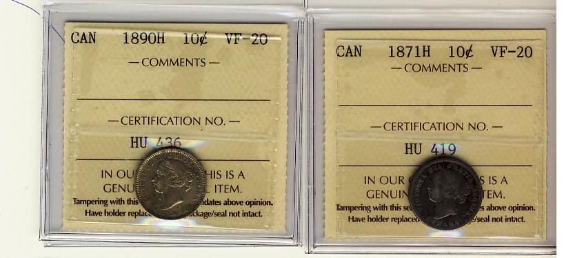 1871H & 1890H 10¢ ICCS VF20. Lot of 2 coins.