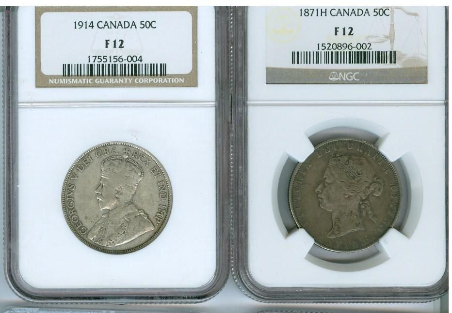 1871H & 1914 50¢ NGC F12. Lot of 2 coins.