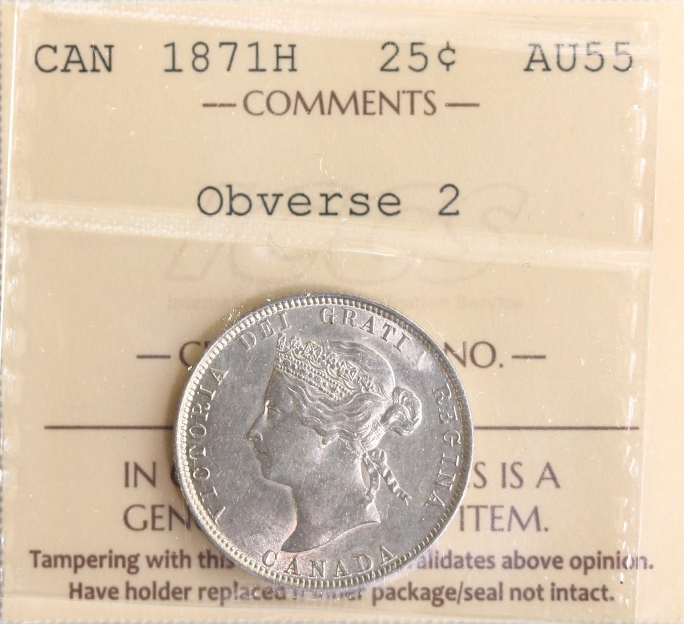 1871H 25¢ "OBV.2" ICCS Choice About Uncirculated-55 Brilliant and lustrous.