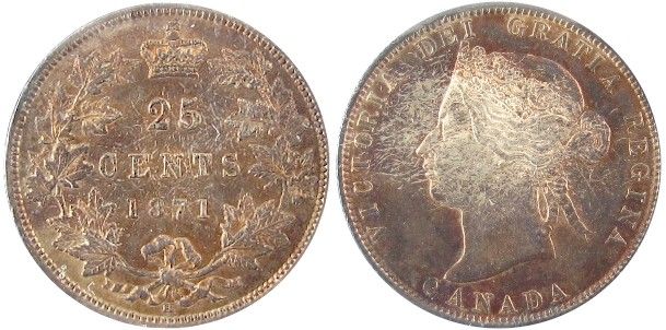 1871H 25¢ Obv 2 ICCS MS63. Deep red and blue tones.