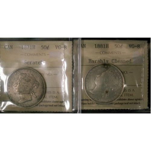 1871H and 1881H 50¢. Lot of 2 coins both graded ICCS VG8. 1871H designated scratch and the 1881H Harshly cleaned.