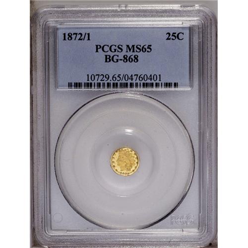 <B>1872/1<25C> Indian Round 25 Cents, BG-868, High R.4, MS65 PCGS.</B></I> The numerator nearly touches the leaf above. A lovely cameo Gem with nearly pristine surfaces. The reverse center has minor softness of strike. Population: 17 in 65, 0 finer (3/06). <BR><BR><B>Important notice:</B> Heritage usually auctions material at the rate of 200-250 lots per hour. On some occasions eBay Live bid software or the Internet may not be able to keep up with the pace of the auction. We recommend placing a realistic absentee bid now as insurance to avoid disappointment. Occasionally the auctioneer may eliminate or reject an eBay Live bid, and the auctioneer may also reopen a lot after the close of the eBay live bidding (usually because we missed an audience bid), and may reject your bid even if it shows you as the winning bidder. By bidding via eBay Live, you agree that Heritage may award the lot to another bidder at its sole discretion under the circumstances described above or any other reasonable circumstances. Since eBay bids are not shown to us until we open the lot on the floor, we treat those bids just like floor bids. In most cases the floor responds before the eBay bid is presented to us, due to Internet lag time, so for consistency we have made it a policy that floor bids are always considered first over tie eBay live bids. Also please note that all Heritage lots purchased through eBay Live carry a 20% Buyer's Premium. Please make sure you read the Terms and Conditions before you bid. This lot is being auctioned in conjunction with a live floor auction by Heritage Galleries & Auctioneers. All final auction and invoice information will be supplied by Heritage Galleries & Auctioneers, and all other information should be considered preliminary. Lot:4794 <BR><BR><B>Winning Notification and Billing:</B> After the FINAL session in this auction is complete, Heritage will send e-mail and snail mail invoices. This process normally takes several days. All final auction and invoice information will be supplied by Heritage Galleries & Auctioneers, and all other information should be considered preliminary. <BR><BR>This auction will be conducted on a live auction floor and over the Internet through eBay Live. If you choose to place an absentee bid, please take a moment to <font color='#0000ff'><u><a href='http://pages.ebay.com/liveauctions/help/before/laabsentee.html'>learn how eBay Live absentee bidding works</a></u></font><font color='#000000'>