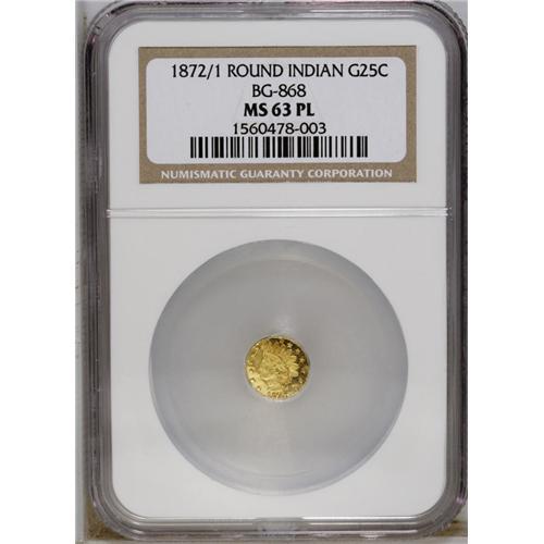<B>1872/1 25C Indian Round 25 Cents, BG-868, High R.4, MS63 Prooflike NGC.</B></I> Radiant devices and flashy fields ensure the eye appeal of this Period Two example, which is well struck save for softness on the central reverse legends. A retained lamination is noted at 2 o'clock on the obverse.<BR><BR><b>Shipping:</b> Coins & Currency (<a target="_blank" href="http://www.heritageauctions.com/common/shipping.php">view shipping information</a>)