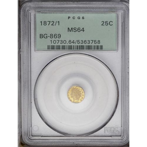 <B>1872/1<25C> Indian Round 25 Cents, BG-869, Low R.4, MS64 PCGS.</B></I> Large Indian head with large stars and large reverse berries. A vertical die crack bisects the reverse and the fields impart a deep prooflike appearance. Rich yellow-golden color with no mentionable abrasions.