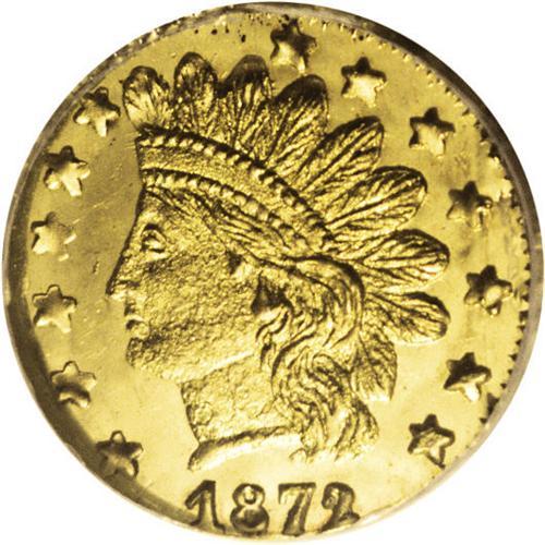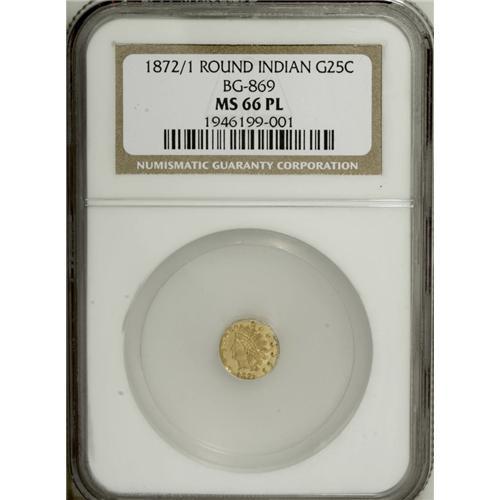 <B>1872/1 25C Indian Round 25 Cents, BG-869, Low R.4, MS66 Prooflike NGC.</B></I> Prominently mirrored fields combine with partly frosted devices to provide exceptional eye appeal. Well struck on the Indian and reverse legends, while the stars and wreath are occasionally soft. A pair of vertical retained laminations near the right obverse border identify this example.<BR><BR><b>Shipping:</b> Coin/Currency (<a target="_blank" href="http://www.heritageauctions.com/common/shipping.php">view shipping information</a>)