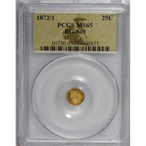 <B>1872/1 25C Indian Round 25 Cents, BG-869, Low R.4, MS65 PCGS.</B></I> A prooflike and boldly struck Gem with lovely honey color and no noticeable contact. A late die state of the reverse, which has a bold vertical die crack and large breaks on the lower portion of the wreath. Population: 10 in 65, 1 finer (8/07). <BR><BR><b>Shipping:</b> Coins & Currency (<a target="_blank" href="http://www.heritageauctions.com/common/shipping.php">view shipping information</a>)