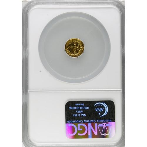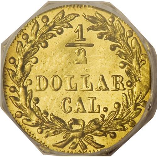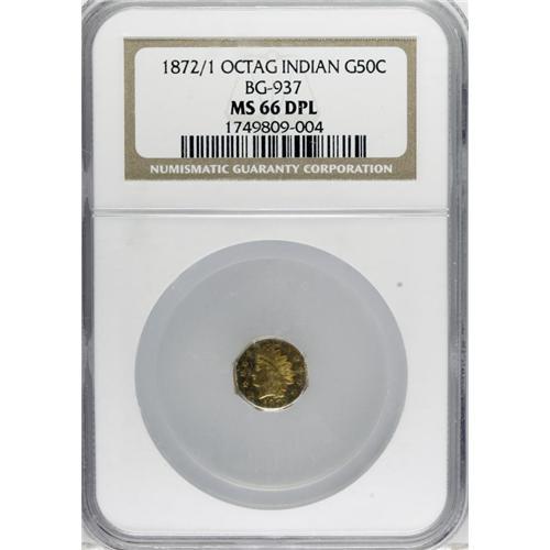 <B>1872/1 50C Indian Octagonal 50 Cents, BG-937, High R.4, MS66 Deep Mirror Prooflike NGC.</B></I> Die State II with a prominent die break near 3 o'clock on the reverse. As of (4/07), this is the finest certified example of BG-937, the only piece to reach the MS66 level, and the only one certified as Deep Mirror Prooflike. This yellow-gold beauty is flawless except for the slight softness of strike on the denominator and the base of the date.<BR><I>From The Diamond K Collection of California Fractional Gold.</B></I><BR><BR><b>Shipping:</b> Coins & Currency (<a target="_blank" href="http://www.heritageauctions.com/common/shipping.php">view shipping information</a>)