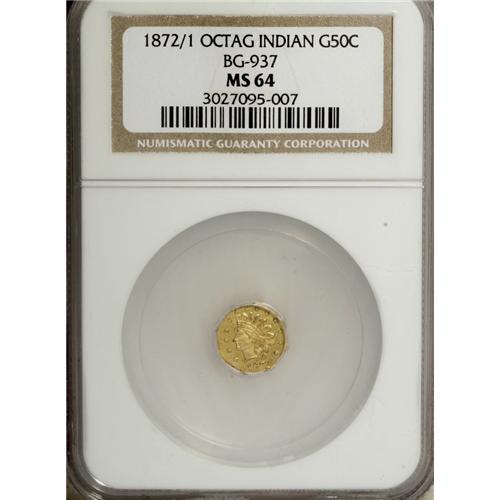 <B>1872/1 50C Indian Octagonal 50 Cents, BG-937, High R4, MS64 NGC.</B></I> NGC Census: (4/4). PCGS Population (24/3). (#10795)<BR><BR><b>Shipping:</b> Coins & Currency (<a target="_blank" href="http://www.heritageauctions.com/common/shipping.php">view shipping information</a>)