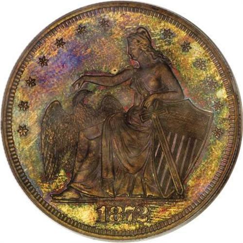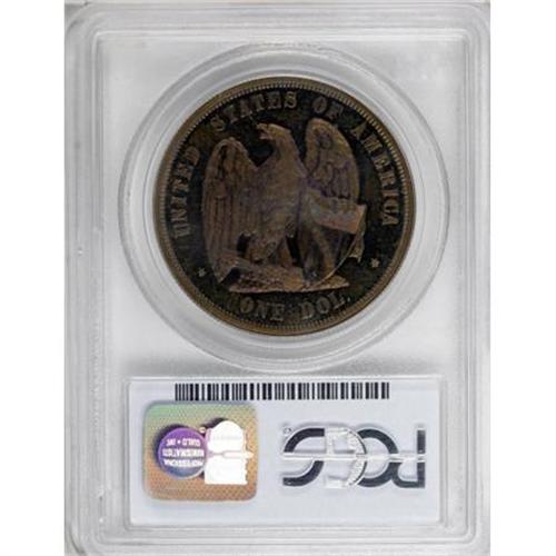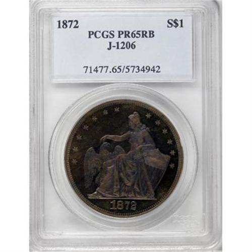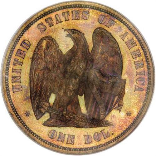 <B>1872 $1 Amazonian Dollar, Judd-1206, Pollock-1346, R.7, PR65 Red and Brown PCGS.</B></I> The obverse exhibits a seated figure of Liberty, her right hand above the head of an eagle, her left forearm resting on top of a shield, and her left hand holding a sword. Around, 13 stars with the date below. The reverse has an eagle with spread wings, clutching three arrows in its right claw, its left leg raised up with the talon supporting a shield with an olive branch in front. A scroll across the shield is inscribed IN GOD WE TRUST. Around is the legend UNITED STATES OF AMERICA with the denomination HALF DOL below. Struck in copper with a reeded edge. <BR> This is one of several different designs the depict a full view of Liberty in a seated position, obviously intended to be an answer to Christian Gobrecht's design that had been in use since 1836. Although several different "Seated Liberty" designs were prepared, the initial design by Gobrecht remained in use until introduction of the Morgan dollar in 1878 and the Barber series of silver coins in 1892.<BR> Both sides of this Gem have excellent contrast with fully mirrored fields visible beneath gold, blue, and sea-green toning. This pattern variety is an important rarity with just nine examples confirmed to exist, including two museum pieces, in the Durham Western Heritage Museum and the Connecticut State Library. This example has a tiny edge mark at 2:45, now mostly hidden by the holder. It has a pedigree back to the Andrew Zabriskie Collection.<BR><I>Ex: Andrew Zabriskie; Major Lenox Lohr; Bowers and Ruddy (11/1976), lot 998; Fairfield Collection (Bowers and Ruddy, 10/1977), lot 61.</B></I><BR><BR><b>Shipping:</b> Coins & Currency (<a target="_blank" href="http://www.heritageauctions.com/common/shipping.php">view shipping information</a>)
