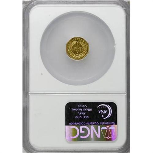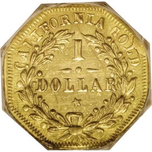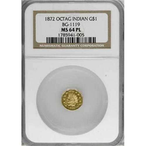 <B>1872 $1 Indian Octagonal 1 Dollar, BG-1119, High R.5, MS64 Prooflike NGC.</B></I> A flashy yellow-gold representative with a well struck wreath and portrait. The obverse field is slightly cloudy. Most (and possibly all) examples of this variety have a die break above the L in GOLD. The O in DOLLAR is widely recut. Census: 2 in 64 Prooflike, 2 finer (6/07).<BR><BR><b>Shipping:</b> Coins & Currency (<a target="_blank" href="http://www.heritageauctions.com/common/shipping.php">view shipping information</a>\)