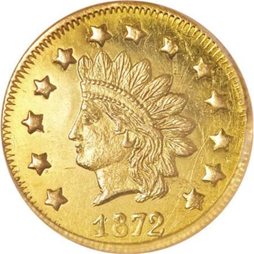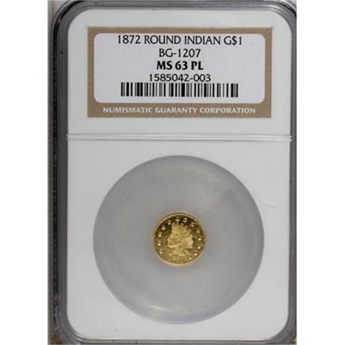 <B>1872 $1 Indian Round 1 Dollar, BG-1207, R.4, MS63 Prooflike NGC.</B></I> The penultimate Period Two variety, from the same obverse die as the famous BG-1208 Token variety. Sharply struck except for the 87 in the date. Minor marks near the final obverse star and the reverse center dot are appropriate for the grade. Struck with close to medal turn.<BR><BR><b>Shipping:</b> Coins & Currency (<a target="_blank" href="http://www.heritageauctions.com/common/shipping.php">view shipping information</a>)