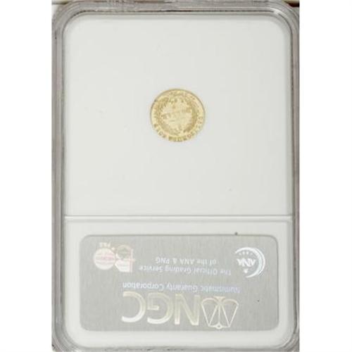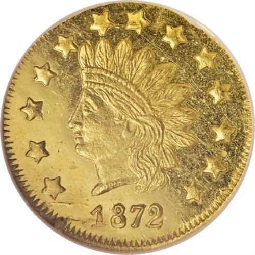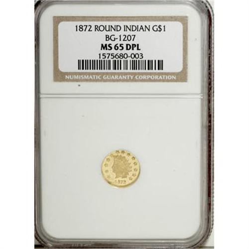 <B>1872 $1 Indian Round 1 Dollar, BG-1207, R.4, MS65 Deep Prooflike NGC.</B></I> This remarkably preserved prooflike Gem has flashy straw-gold fields and an unabraded appearance. The obverse is well struck, especially on the portrait and date, and only isolated areas of the reverse reveal appreciable softness. A few thin retained laminations are noted near the borders.<BR><BR><BR><b>Shipping:</b> Coins & Currency (<a target="_blank" href="http://www.heritageauctions.com/common/shipping.php">view shipping information</a>\)